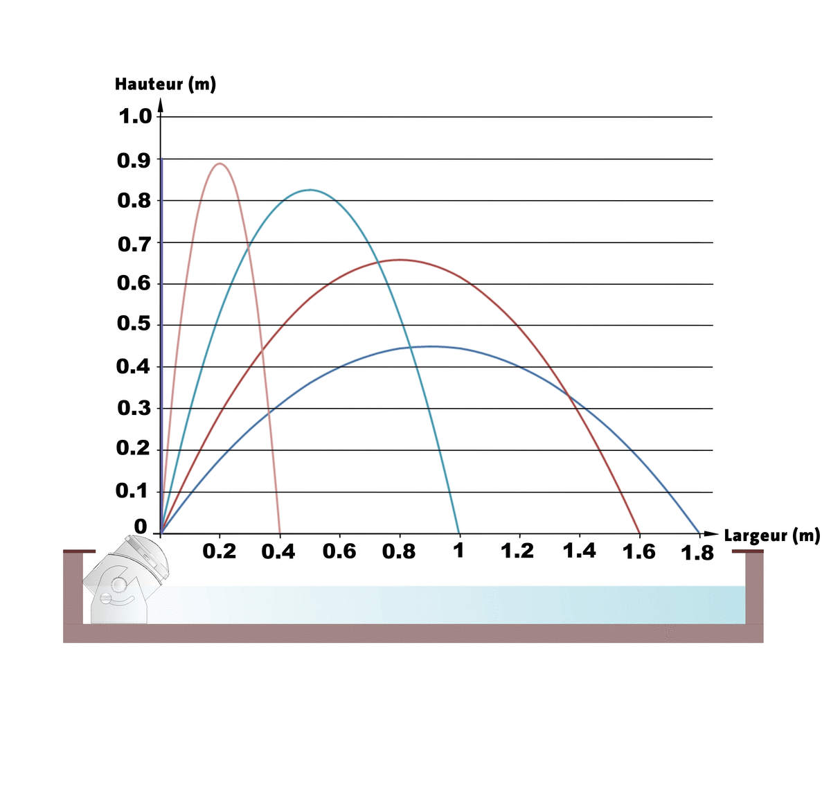 - Amplitude maximale de jet 1,8 m, hauteur maximale de jet 0,9 m