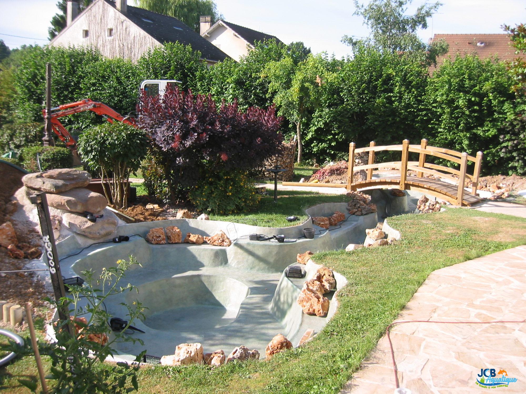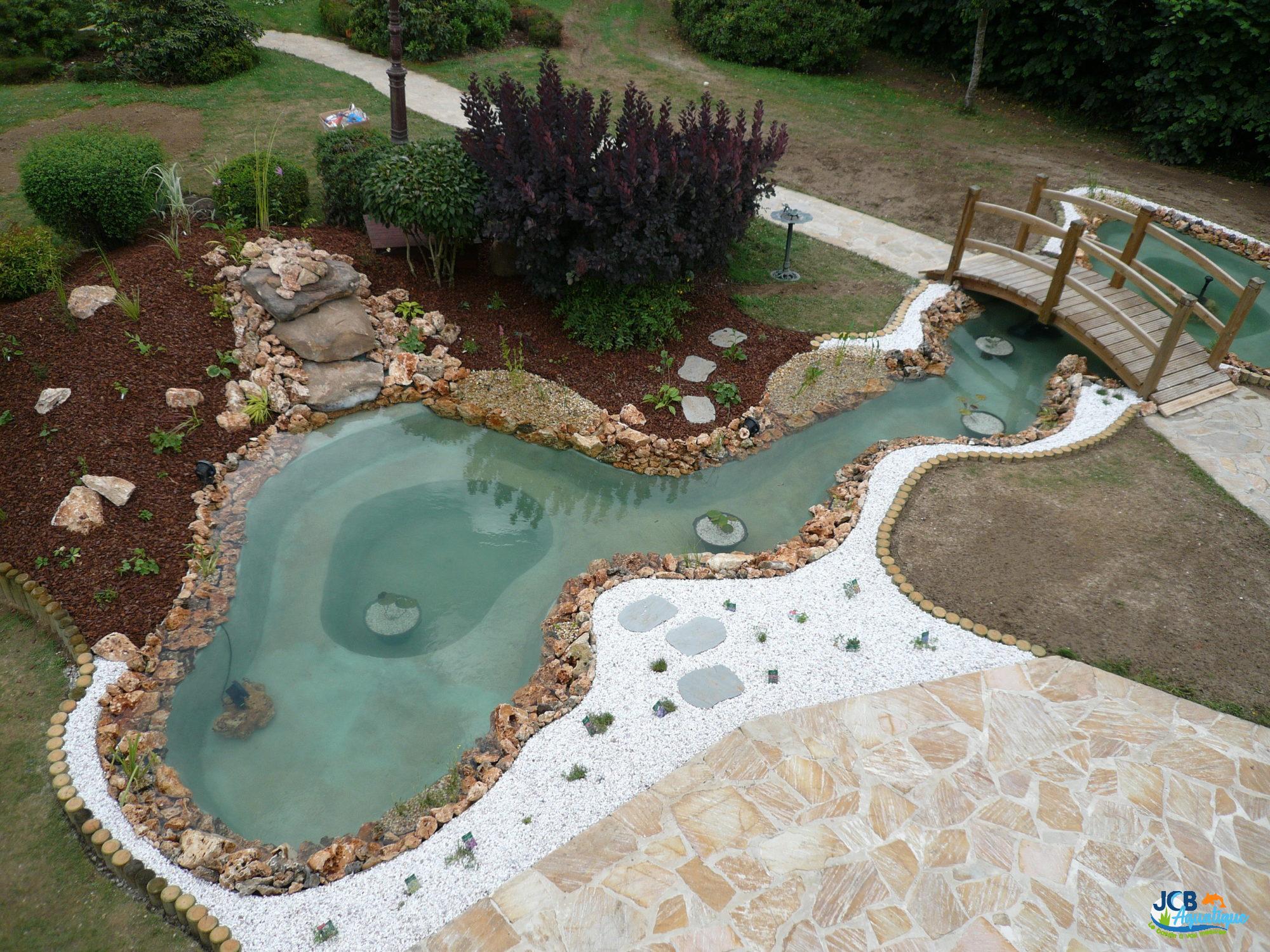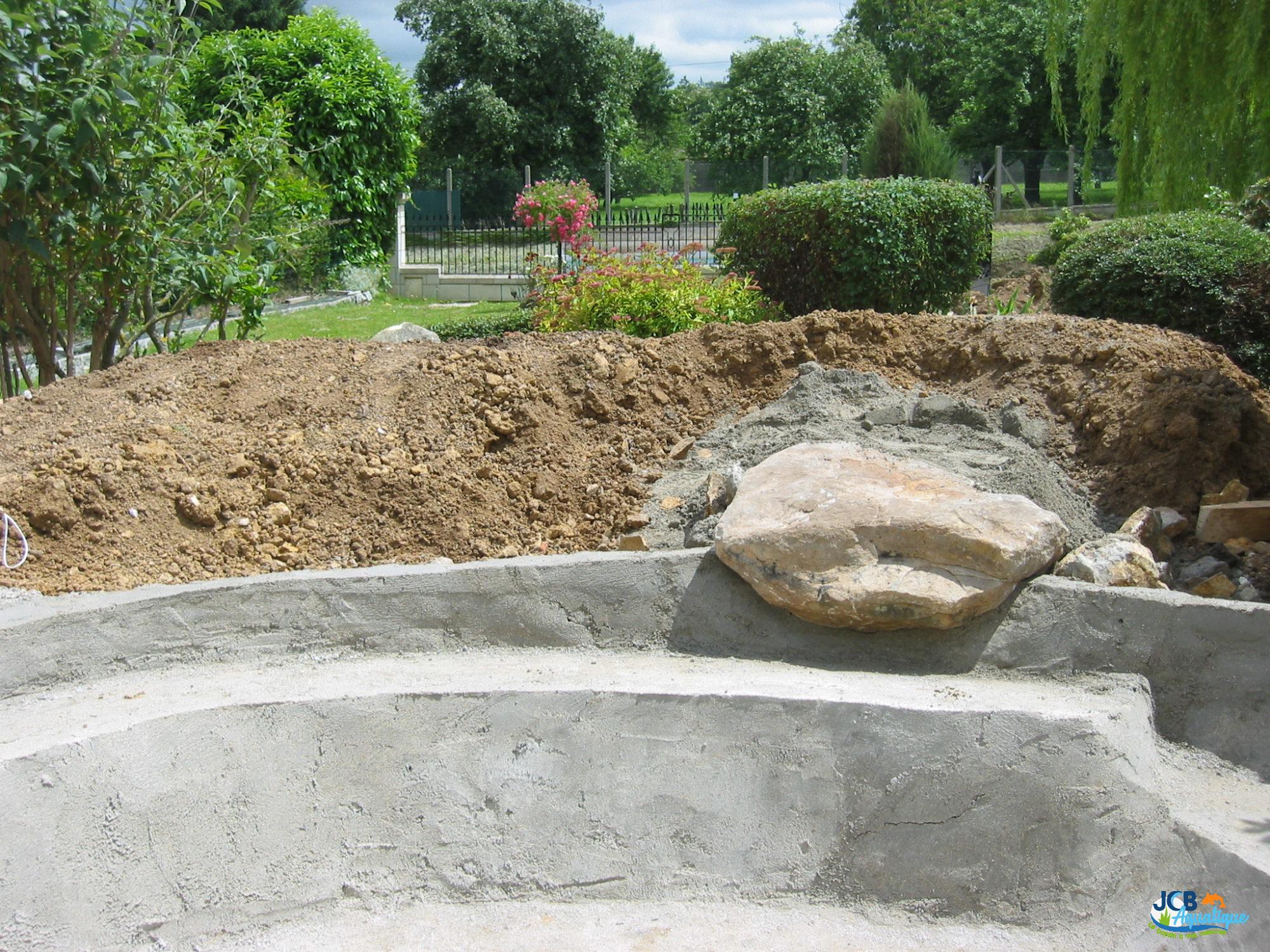 Agrément du bassin par la présence d’une cascade en pierres naturelles, réalisation de zones de berges et de zones plus profondes à divers endroits du bassin pour les plantes et les poissons.