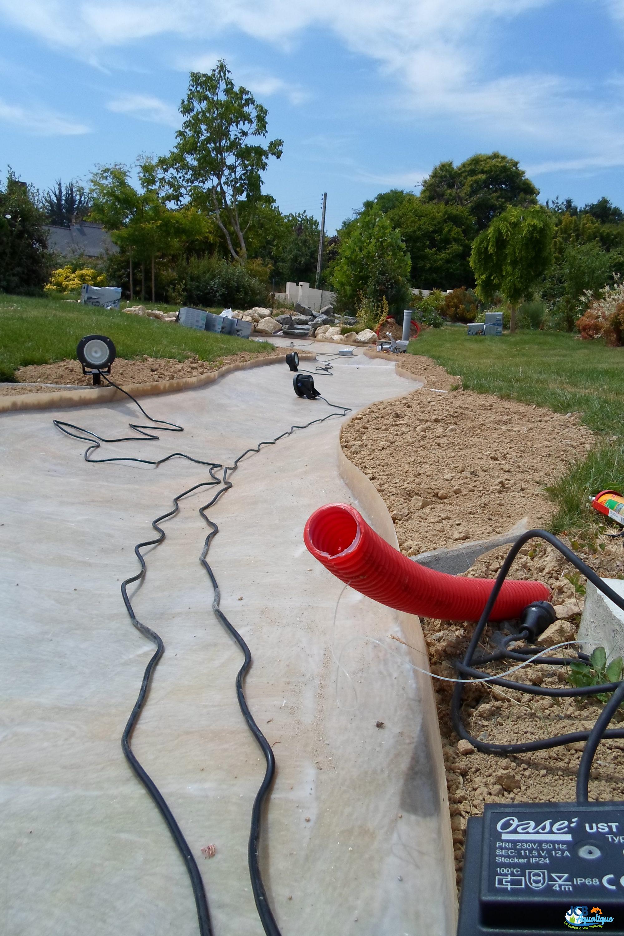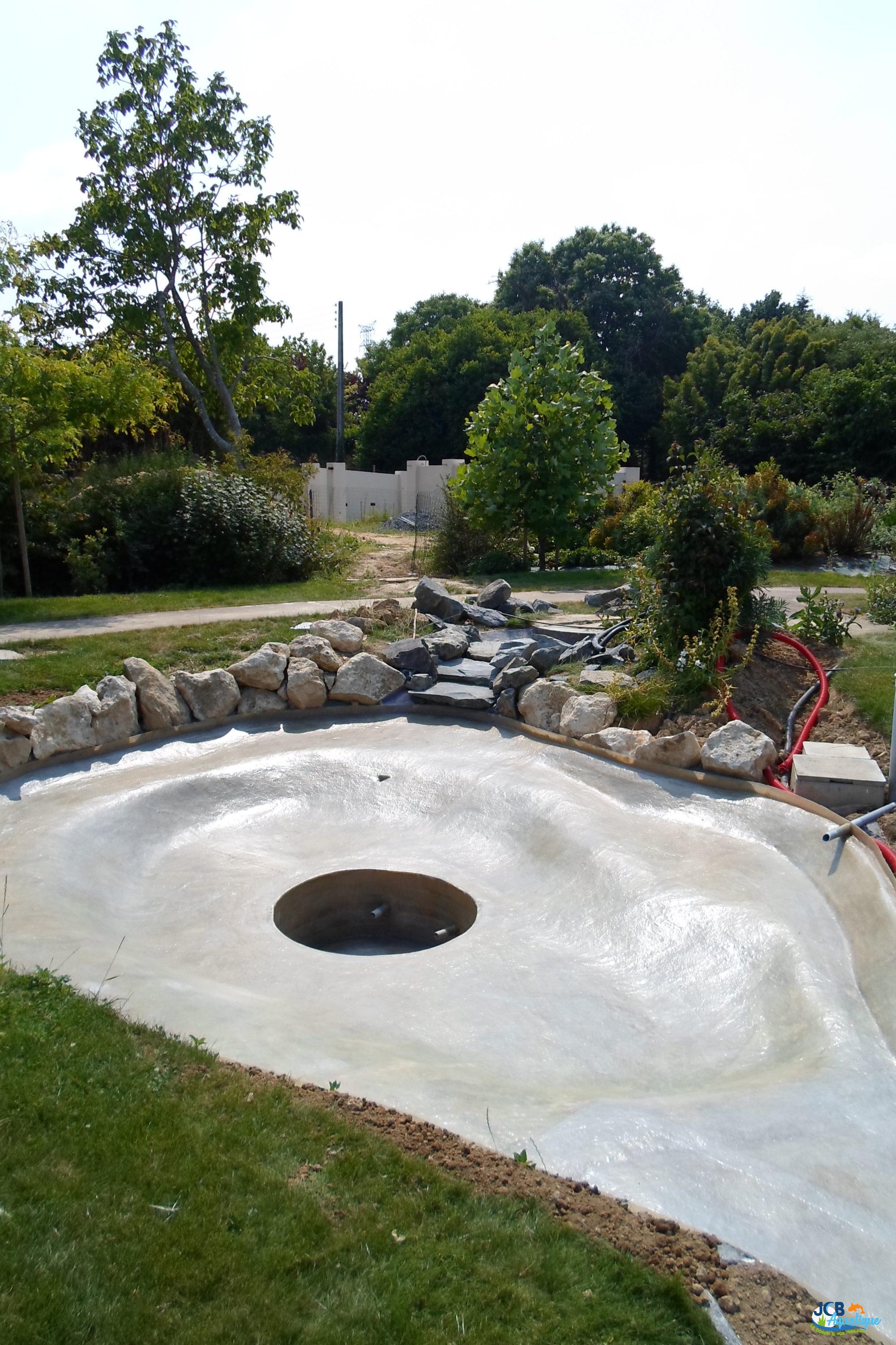 Mise en place d’un bassin stratifié sur place. agrémenté d’une cascade de galets.