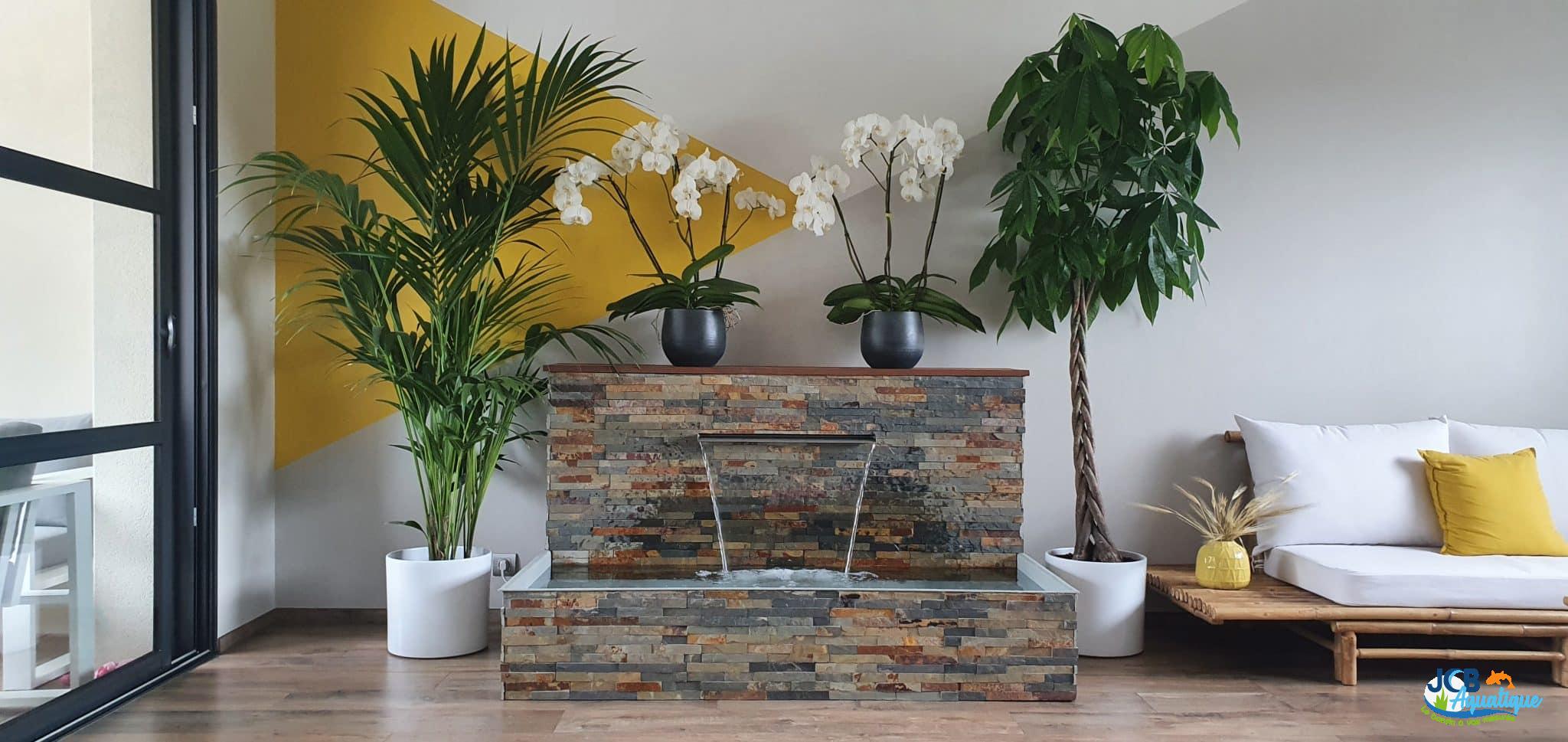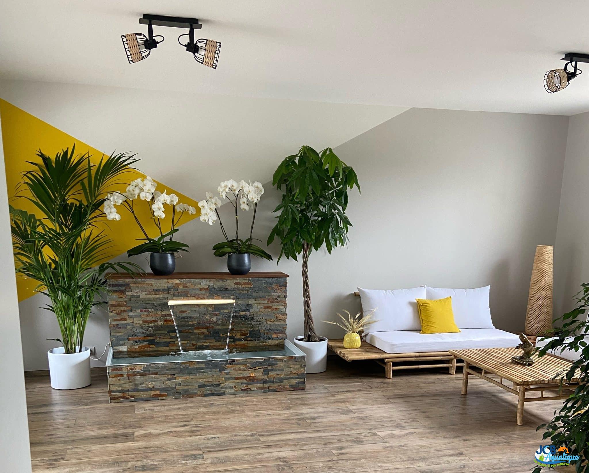 Réalisation et mise en place d’un bassin avec son mur d’eau sur mesure dans un salon intérieur.