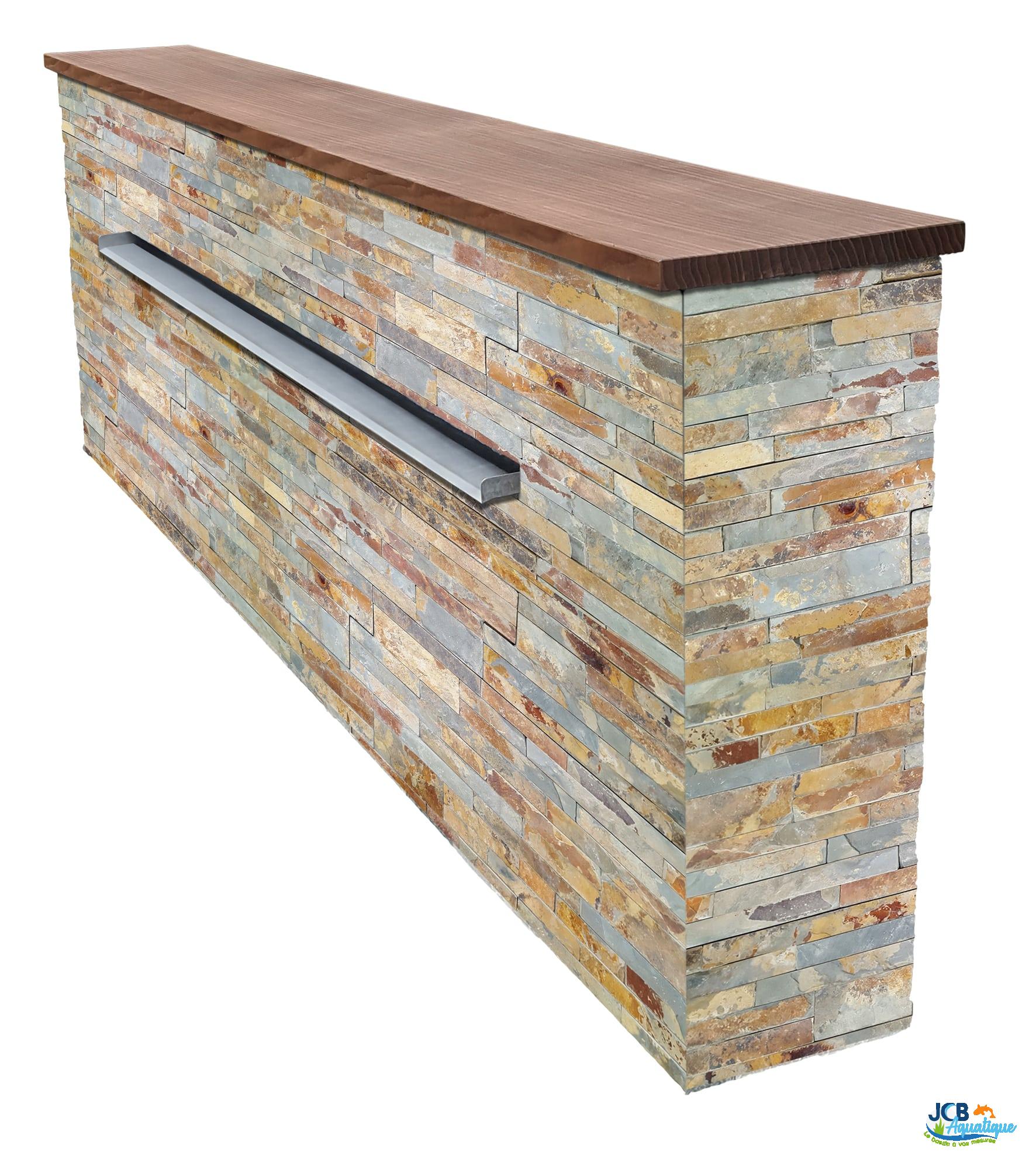 - Fabrication en atelier d’un muret en parement de pierres naturelles avec intégration lame d’eau inox largeur 90 cm.